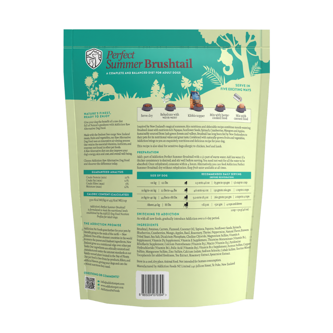 Celebrate the vibrant spirit of New Zealand’s summers with Perfect Summer Brushtail—a recipe that brings together the wild flavors of sustainably sourced Brushtail and a medley of sun-ripened superfoods. This air-dried, “meat-muesli” creation features tender Brushtail meat, carrots, flaxseed, papayas, cranberries, blueberries, mangoes, apples, basil, rosemary, thyme, peppermint, and spinach. Crafted for dogs with sensitivities, this recipe is free from chicken, beef, and lamb, making it a gentle yet gourmet choice for discerning pets. Serve it dry, rehydrate for a softer meal, or use as a topper—Perfect Summer Brushtail offers flexibility and delight in every bowl.