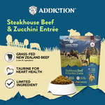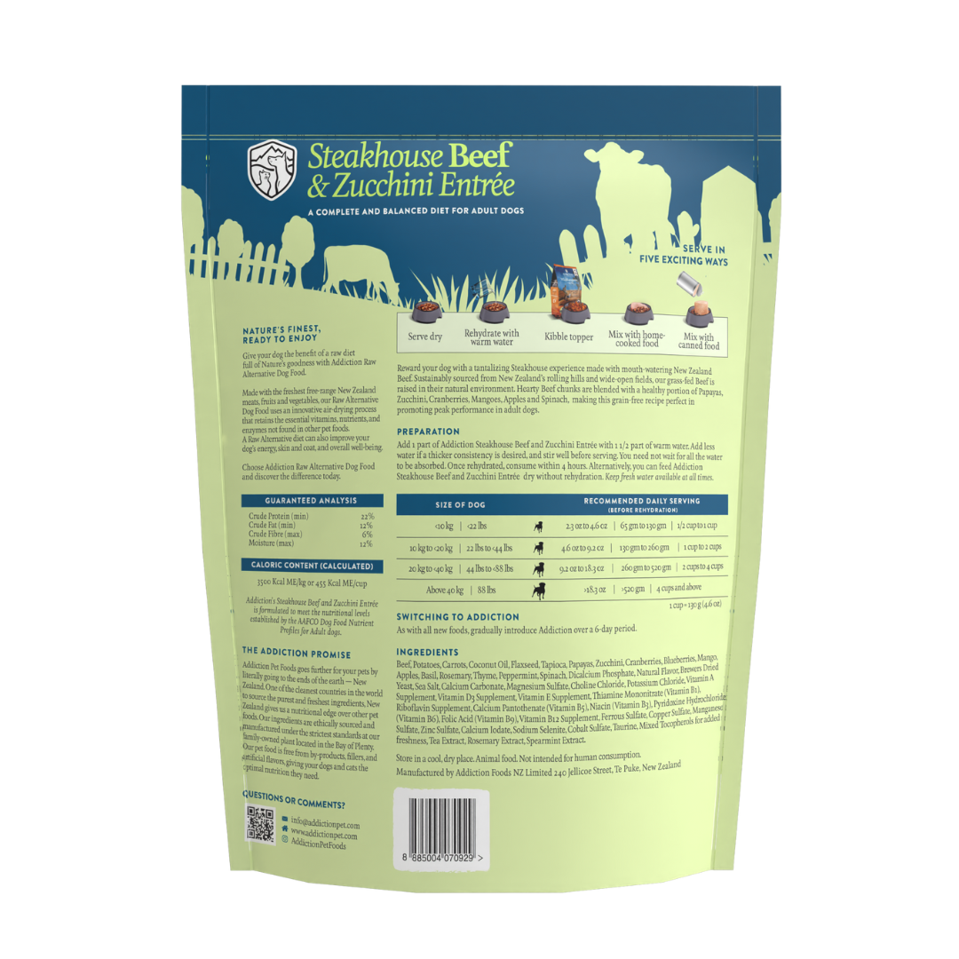 Bring home the classic Steakhouse experience with Steakhouse Beef & Zucchini Entrée—a recipe crafted for dogs who crave the rich taste of New Zealand’s grass-fed beef. Sustainably raised on open pastures, our beef is naturally wholesome and free from growth hormones. Each air-dried, “meat-muesli” meal features hearty beef chunks paired with zucchini, carrots, flaxseed, papayas, cranberries, blueberries, mangoes, apples, basil, rosemary, thyme, peppermint, and spinach. This grain-free recipe is a fan- favorite, offering a delicious and nutritious choice for adult dogs. Serve it dry, rehydrate for a softer meal, or use as a topper—Steakhouse Beef & Zucchini Entrée delivers versatility and satisfaction in every bowl.