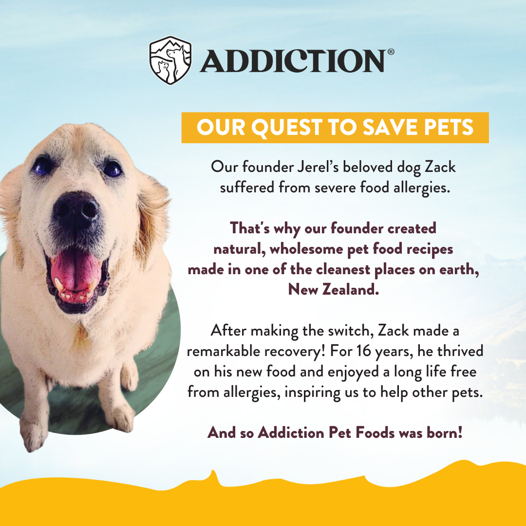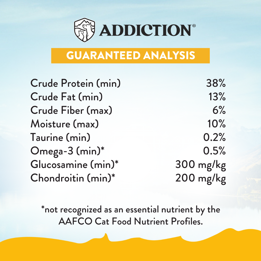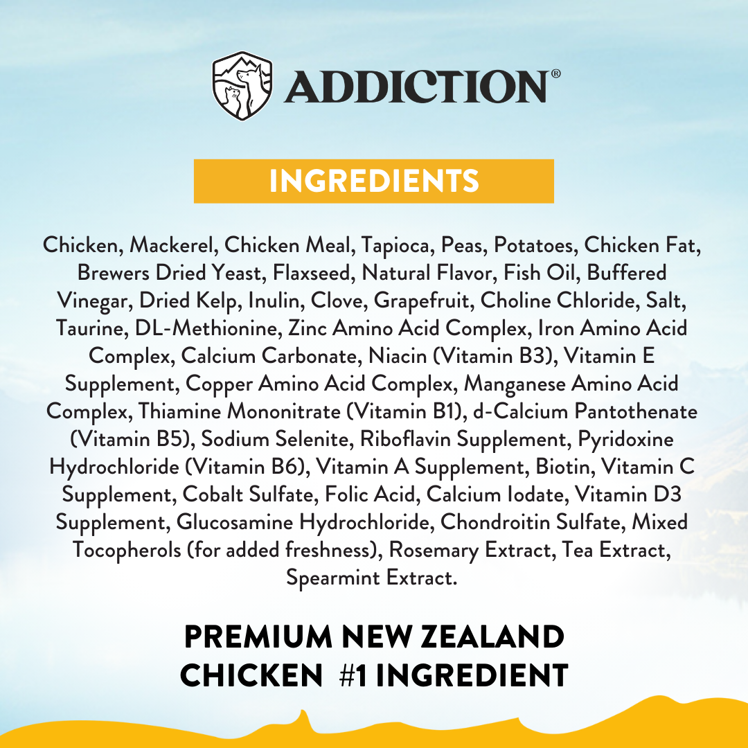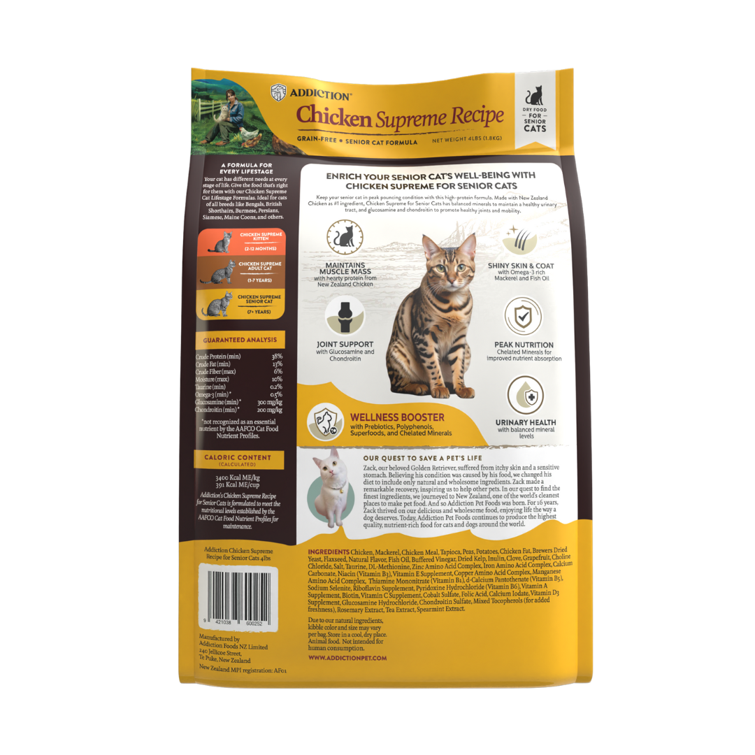 Addiction’s Chicken Supreme Recipe for Senior Cats is expertly crafted to support your cat’s healthy aging. Featuring premium New Zealand chicken as the #1 ingredient and mackerel for added protein and flavor, this grain-free formula is designed to maintain lean muscle, support joint health, and promote overall vitality. Enriched with omega-rich fish oil, flaxseed, and a unique blend of superfoods, it delivers targeted nutrition for senior cats of all breeds—without artificial colors, flavors, or preservatives.