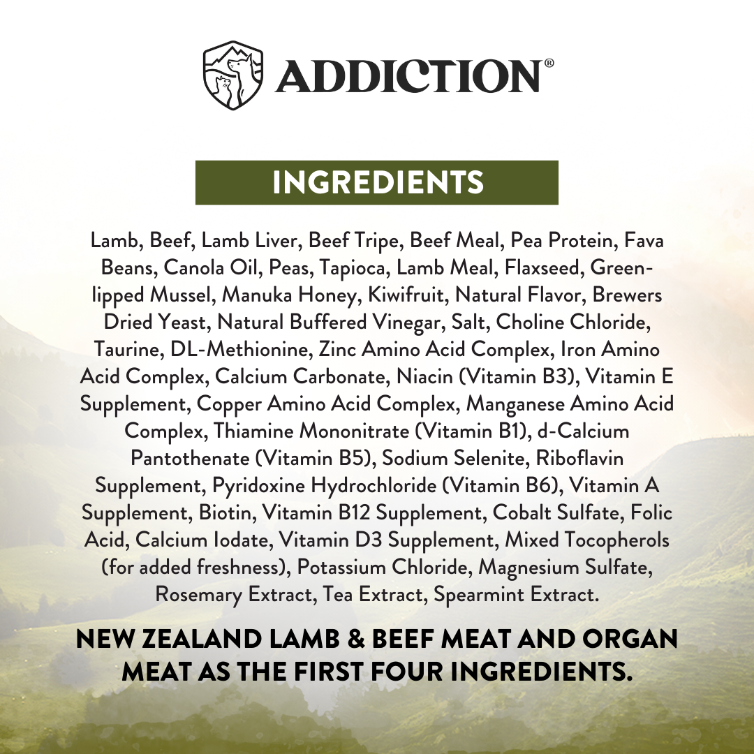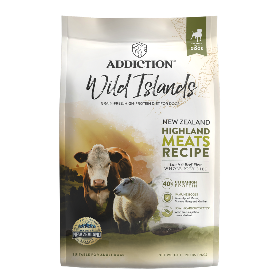 In the wild, dogs thrive on a protein-rich and low-carbohydrate diet. That’s why Highland Meats has ultrahigh protein levels at 40% and is free from potato, corn, soy and wheat. Highland Meats is made with grass-fed New Zealand Lamb and Beef high in amino acids and iron. With nutrient-dense organ meats and antioxidant-rich Green-lipped Mussel, Manuka Honey and Kiwifruit, Highland Meats offers your dogs a nutritious and wildly satisfying diet.