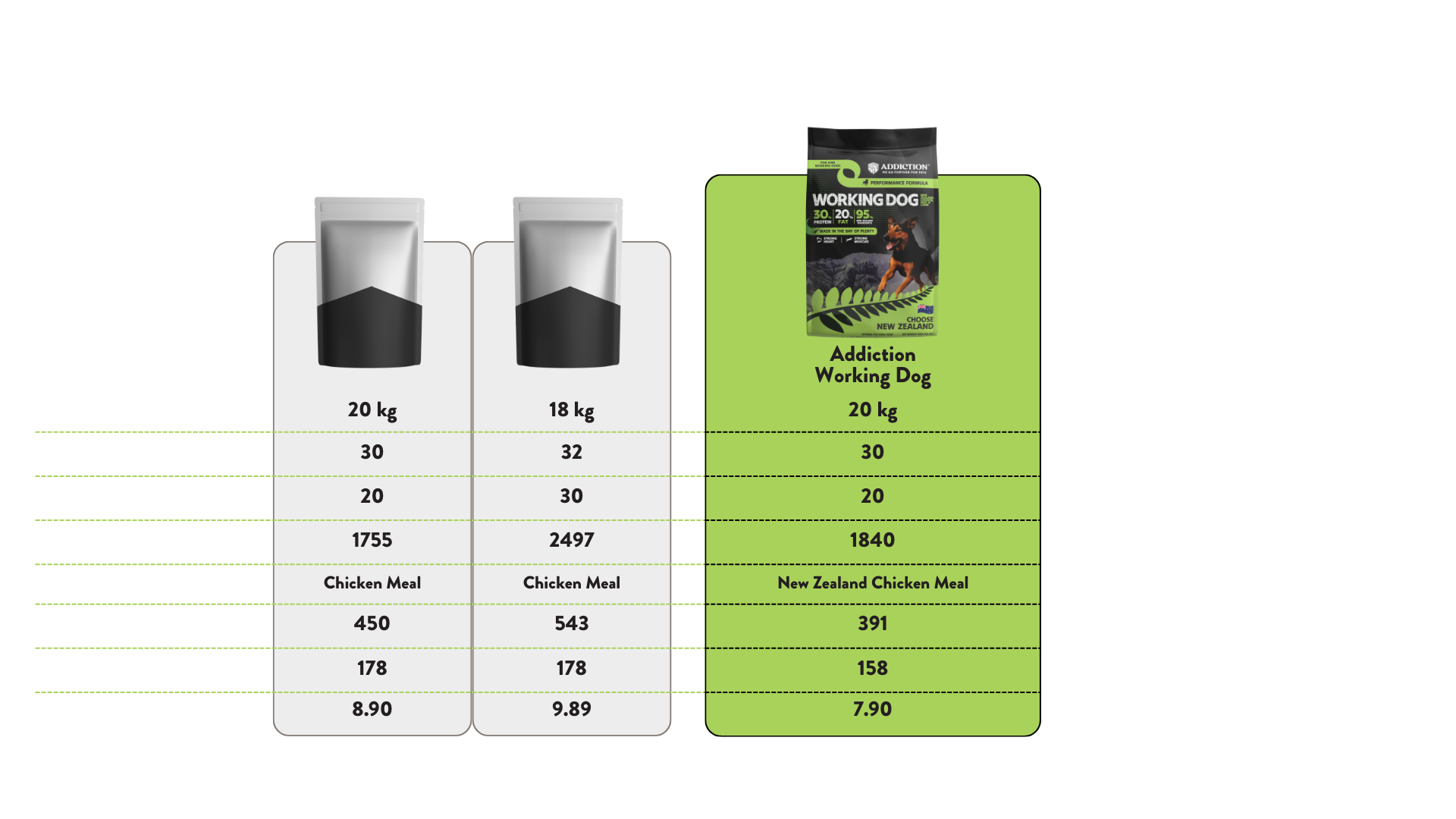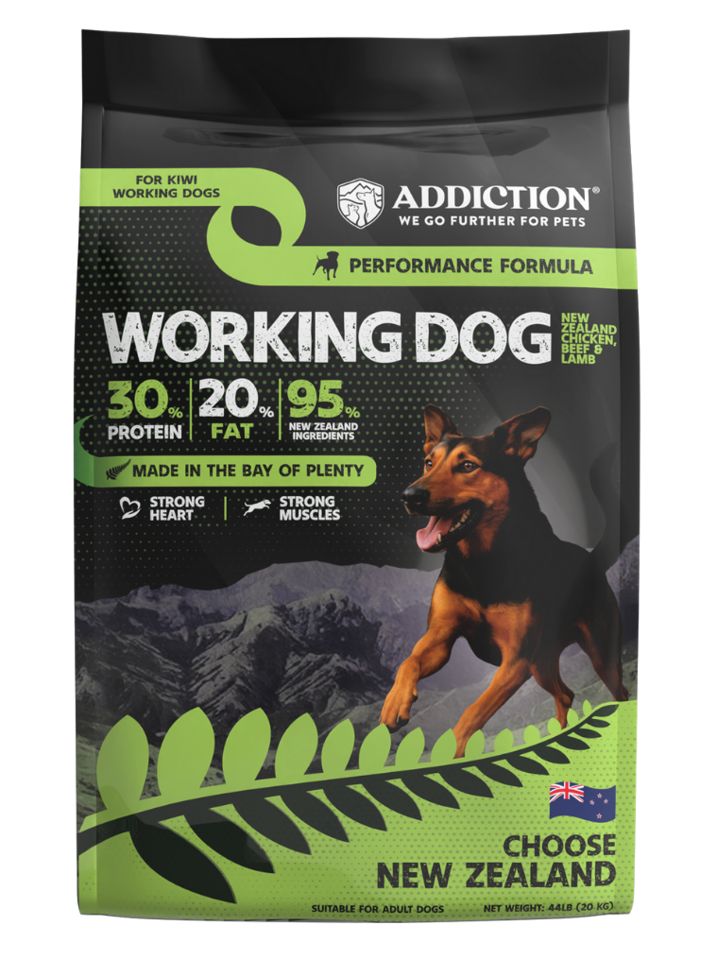 Addiction Pet Foods — founded in New Zealand with over 20 years of nutrition expertise. The Working Dog formula is made at our Te Puke plant using 95% New Zealand–sourced ingredients, giving farmers local quality, traceability, and reliable supply.