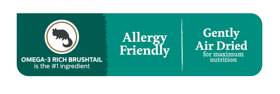 Brushtail, Potatoes, Carrots, Flaxseed, Coconut Oil, Tapioca, Papayas, Sunflower Seeds, Spinach, Blueberries, Cranberries, Mango, Apples, Basil, Rosemary, Thyme, Peppermint, Natural Flavor, Brewers Dried Yeast, Sea Salt, Dicalcium Phosphate, Choline Chloride, Magnesium Sulfate, Vitamin A Supplement, Vitamin D3 Supplement, Vitamin E Supplement, Thiamine Mononitrate (Vitamin B1), Riboflavin Supplement, Calcium Pantothenate (Vitamin B5), Niacin (Vitamin B3), Pyridoxine Hydrochloride (Vitamin B6), Folic Acid (Vitamin B9), Vitamin B12 Supplement, Ferrous Sulfate, Copper Sulfate, Manganese Sulfate, Zinc Sulfate, Calcium Iodate, Sodium Selenite, Cobalt Sulfate, Taurine Mixed Tocopherols for added freshness,, Tea Extract, Rosemary Extract, Spearmint Extract.